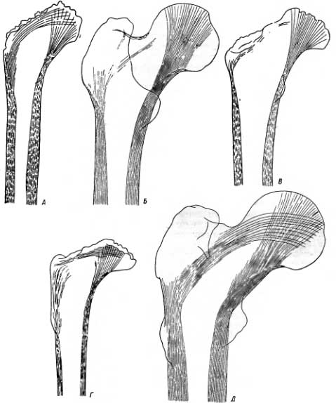Рис. 110. А — структура спонгиозных пластинок шейки бедра, характеризующаяся наличием двух почти одинаково выраженных пучков с медиальной и латеральной сторон (у ребенка-неандертальца); Б — структура губчатого вещества головки и шейки бедра современного взрослого; В — структура губчатого вещества шейки бедра современного ребенка 8–9 лет; Г — структура губчатого вещества шейки бедра современного ребенка 8–9 лет при наличии третьего вертела; Д — структура губчатого вещества головки и шейки бедра современного человека при наличии третьего вертела.