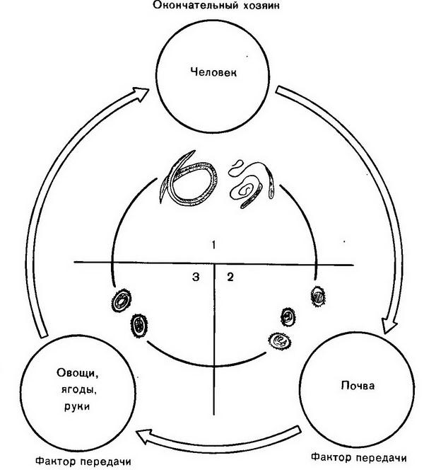 1 - половозрелая особь в кишечнике человека; 2 - яйца, созревающие в почве; 3 - яйца с инвазионной личинкой на овощах и ягодах.