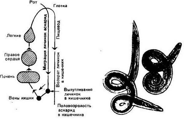 Из проглоченных яиц в кишечнике человека выходят личинки, которые проникают в венозную систему и с током крови через правую половину сердца в легкие. Здесь личинки, разрывая капилляры, оказываются в просвете альвеол. Попадая через бронхи вновь в глотку, они заглатываются со слюной и в кишечнике, спустя 2,5–3 мес, превращаются во взрослых аскарид (рис. 6.9),