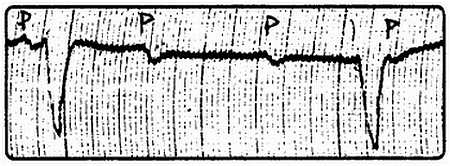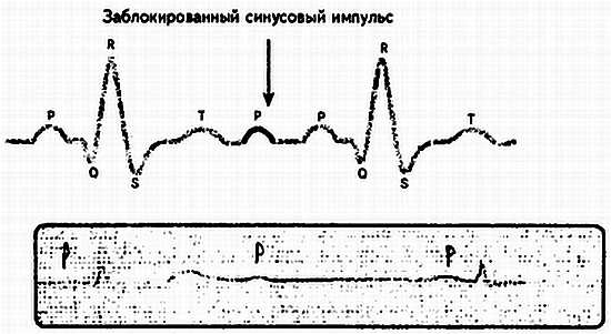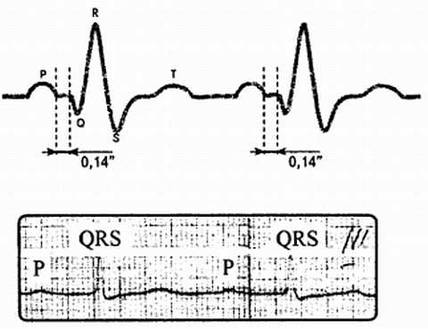 Напротив, синусовые импульсы, не прошедшие атриовентрикулярное соединение, будут «одинокими», без связи с комплексом QRS, что хорошо заметно на электрокардиограмме: вслед за зубцом Р на ЭКГ ленте записывается прямая изоэлектрическая линия.