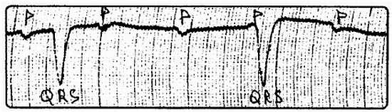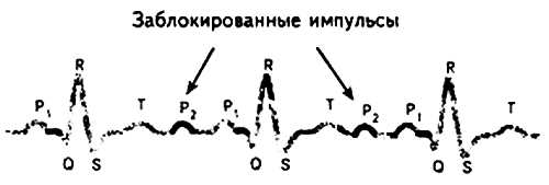 При этом варианте проводимость соединения настолько ухудшена, что после прохождения одного синусового импульса проведение к желудочкам второго становится уже невозможным.