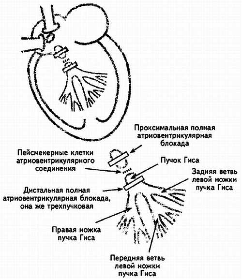 Блокаду, которая имеет место в самом атриовентрикулярном соединении, называют проксимальной; она как бы ближе по анатомическому уровню к предсердиям. Трехпучковую блокаду называют дистальной, подчеркивая ее удаленность от предсердий. Однако суть не только в различном названии этих вариантов полной блокады, главное — наличие разных источников ритма для желудочков.
