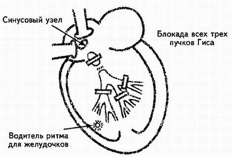 Рис. 65. Схематическое изображение уровня формирования полных атриовентрикулярных блокад