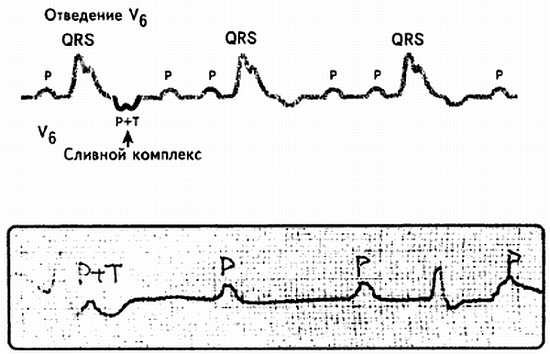 Естественно, одновременное существование двух независимых ритмов (синусового для предсердий, атриовентрикулярного для желудочков) неминуемо приведет к ситуации, когда в определенный момент оба ритма совпадут. На электрокардиограмме при этом произойдет наложение зубца Р (предсердный ритм) на комплекс QRS (желудочковый ритм), и в итоге получится так называемый сливной комплекс.