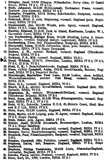 Как и следовало ожидать, «разоблачения» Стида вызвали бурную реакцию в Европе. Германские послы в Лондоне и Париже растерянно хранили молчание. В мае 1940 г. Стид был внесен Вальтером Шелленбергом, начальником отдела АМТ IY-E РСХА (отвечавшим за контршпионаж), в «Специальный розыскной список по Великобритании». В списке указаны фамилии еще 2819 человек как англичан, так и беженцев из Европы, которых следовало арестовать или взять под надзор в случае успеха германского вторжения в Великобританию (рис. 1.14).