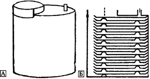 Рис. 1.15. Аппарат для получения бактериальной биомассы. А. Наружный вид. Б. Разрез. Аппарат мог иметь различные размеры. Общая посевная поверхность типового аппарата около 9000 см 2; при толщине слоя агара в 0,5 см в нем использовалось около 4,5 л среды на каждый посев. По Н. Г. Щербиной (1932)