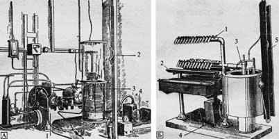Рис. 1.17. Аппараты для лиофильного высушивания биопрепаратов конца 1930-х гг. А. Аппарат камерного типа конструкции Гревеса и Эдера: 1 — компрессорная установка; 2 — сушильник; 3 — конденсатор (змеевик); 4 — вакуум-масляный насос. Б. Коллекторный аппарат Флосдорфа и Мэца: 1 — коллектор с ампулами; 2 — ванна для сухого льда; 3 — конденсатор; 4 — вакуум-масляный насос; 5 — манометр Мак-Леода. По Н. Н. Титову (1945)