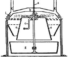 Рис. 1.18. Распылительная центрифуга. Посредством диска g, имеющего большое число оборотов, жидкость, притекающая по трубке а, мелко распыляется горизонтальным слоем. Ниже этого слоя по трубе с подается из распределителя пар, высушивающий распыленную жидкость, твердые частицы которой улавливаются на наклонных стенках кожуха е и собираются в приемник g. Выделившиеся пары осаждаются на крышках i и h, вокруг которых имеется желобок для конденсационной воды. Из желобков вода удаляется по трубе К. По Н. Н. Титову (1945)