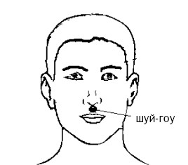 Шуй-гоу расположена в носогубной борозде, почти посередине, но чуть ближе к носу (рис. 17, е). В критических состояниях используют быстрые приемы сильного надавливания.