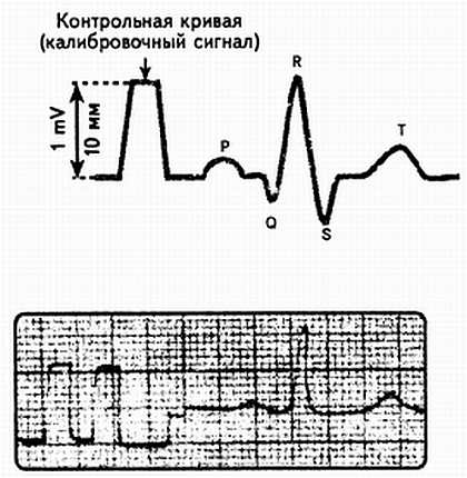 Для запоминания величины (высоты или глубины) основных зубцов необходимо знать: все аппараты, регистрирующие ЭКГ, настроены таким образом, что вычерчиваемый в начале записи контрольный сигнал равен по высоте 10 мм, или 1 милливольту (mV).