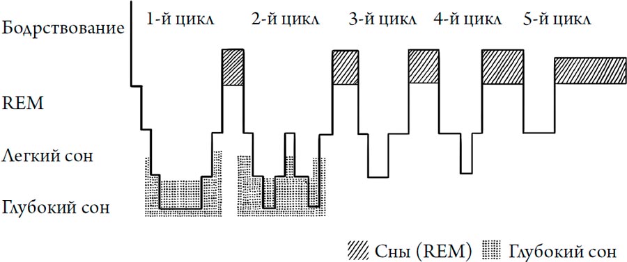 А ведь наш мозг любит и нуждается в регулярном повторении одних и тех же четырех фаз сна, каждая из которых длится примерно по 90 минут: это легкий сон, глубокий сон, быстрый сон (REM-, или БДГ-фаза – быстрые движения глаз), бодрствование. Как в круговой тренировке в спортивном зале, фазы сменяют одна другую, по четыре-шесть раз при средней продолжительности сна в восемь часов. Если эти фазы периодически прерываются, это не остается без последствий.