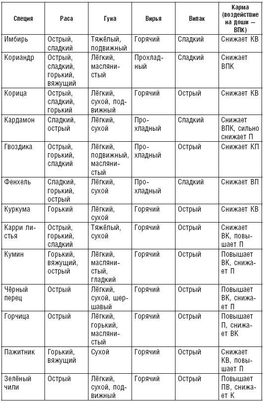 Обычно сладкий и солёный вкусы имеют сладкий випак, кислый вкус имеет кислый випак, острый, горький и вяжущий вкусы имеют острый випак. Раса и випак непосредственно связаны со вкусом веществ, а вирья – с холодным и тёплым качествами веществ. Випак бананов, как это ни странно, кислый. Ниже дана таблица, показывающая гуну (качество), раса, вирья, випак и воздействие на доши наиболее распространённых специй.
