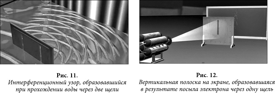 Но, проходя через две щели, волна воды создаст так называемый интерференционный узор, состоящий из многих параллельных вертикальных полосок (подобный всем известному магнитному штрих-коду). Что тоже вполне предсказуемо, потому что все волны (не важно, света или воды) подчиняются закону распространения волны в пространстве.