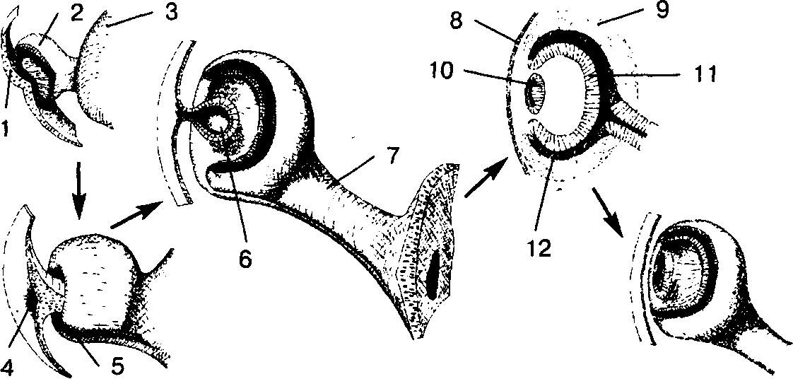 Формирование глаза у зародыша: 1 – эктодерма; 2 – глазной пузырь; 3 – передний мозг; 4 – хрусталиковая ямка; 5 – зрительная щель; в – хрусталиковый пузырек; 7 – глазной стебелек; 8 – роговица; 9 – формирующиеся сосудистая оболочка и склера; 10 – хрусталик; 11 – сетчатка; 12 – пигментный слой
