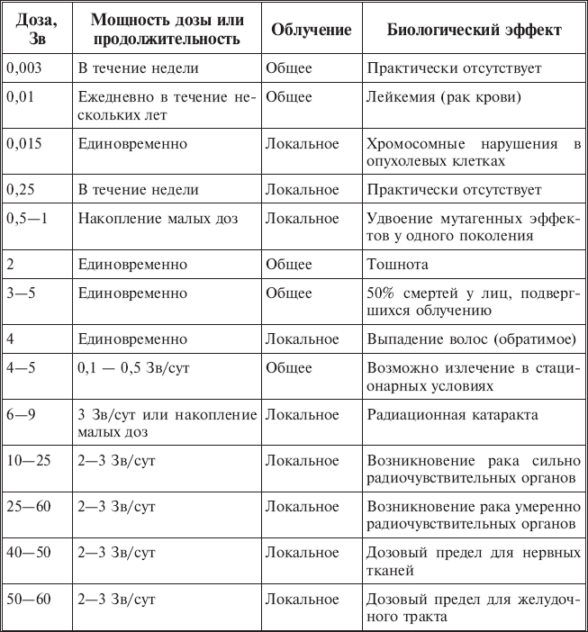 Автор не имел цели напугать читателей этой таблицей. К счастью, доз выше 0,01 Зв в повседневной жизни в доме не бывает (если, конечно, нет какого-либо форс-мажора (например, ребенок не принесет с улицы кем-то случайно забытый источник радиации со стронцием-90). Но радиационную опасность представляют и часы с фосфоресцирующим циферблатом и игрушки, которые светятся в темноте зеленоватым светом.