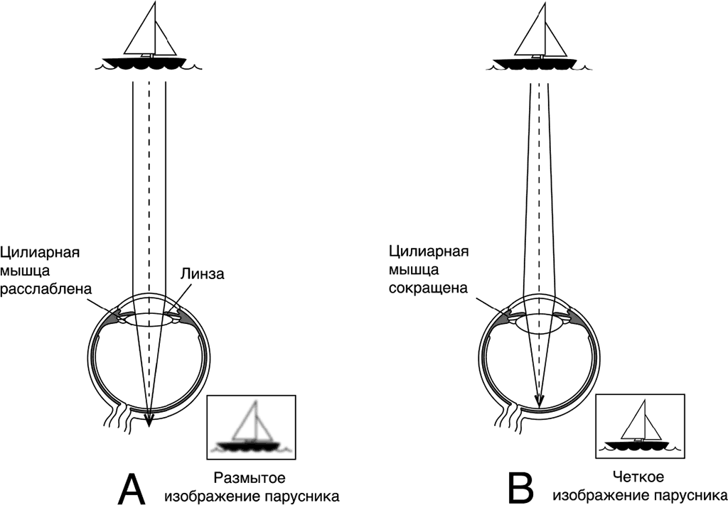 Изображение А. Изображение удаленного объекта при расслабленном состоянии глаза фокусируется за сетчаткой.