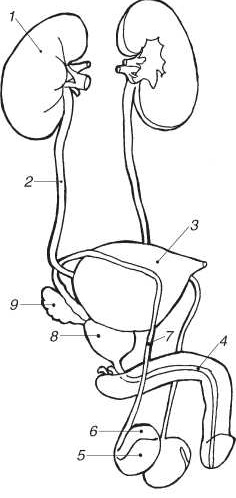 1 — почка; 2 — мочеточник; 3 — мочевой пузырь; 4 — мочеиспускательный канал и губчатое тело полового члена, начинающееся луковицей и заканчивающееся головкой полового члена; 5 — яичко; 6 — придаток яичка; 7 — семявыводящий проток; 8 — предстательная железа; 9 — семенные пузырьки
