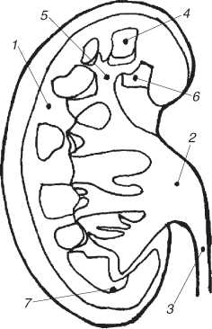 1 — корковый слой почки;2 — почечная лоханка; 3 — мочеточник; 4 — почечная пирамида, оканчивающаяся сосочком; 5 — большая почечная чашка; 6 — малая почечная чашка; 7 — мозговой слой почки