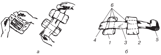 Рис. 6.1. Порядок вскрытия пакета перевязочного индивидуального: а — вскрытие наружной оболочки ППИ и его разворачивание; б — пакет в развернутом виде: 1 — неподвижная подушечка; 2 — подвижная подушечка; 3 — бинт; 4 — конец бинта; 5 — скатка бинта; 6 — цветные нитки